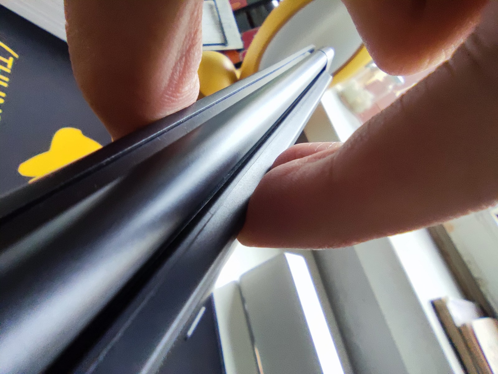这个应该是磁吸合盖的锅,合上盖时候,屏幕中间上下可以贴死,但两侧会翘起来一点,就像一本用了很长时间的日记本中间用绳子绑起来一样